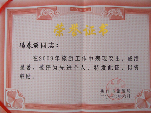 恒橋賓館被焦作市旅游局授予2009年度先進(jìn)旅游單位稱號