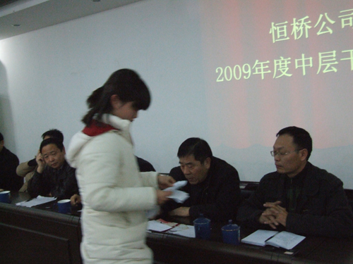 2009年12月3日,公司在物貿(mào)會(huì)議室召開本年度中層干部測評(píng)會(huì)。會(huì)議由監(jiān)事會(huì)主席姬中勝主持,物資局黨委副書記陳相如和政工科干事金靜蒞臨指導(dǎo)。 在公司15位中層干部對自己本年度的工作進(jìn)行述職后,全體員工對其予以評(píng)議打分。物資局陳書記對從公司長遠(yuǎn)發(fā)展出發(fā),大家以公正、客觀的心態(tài)認(rèn)真對中干打分的考核作法予以肯定。